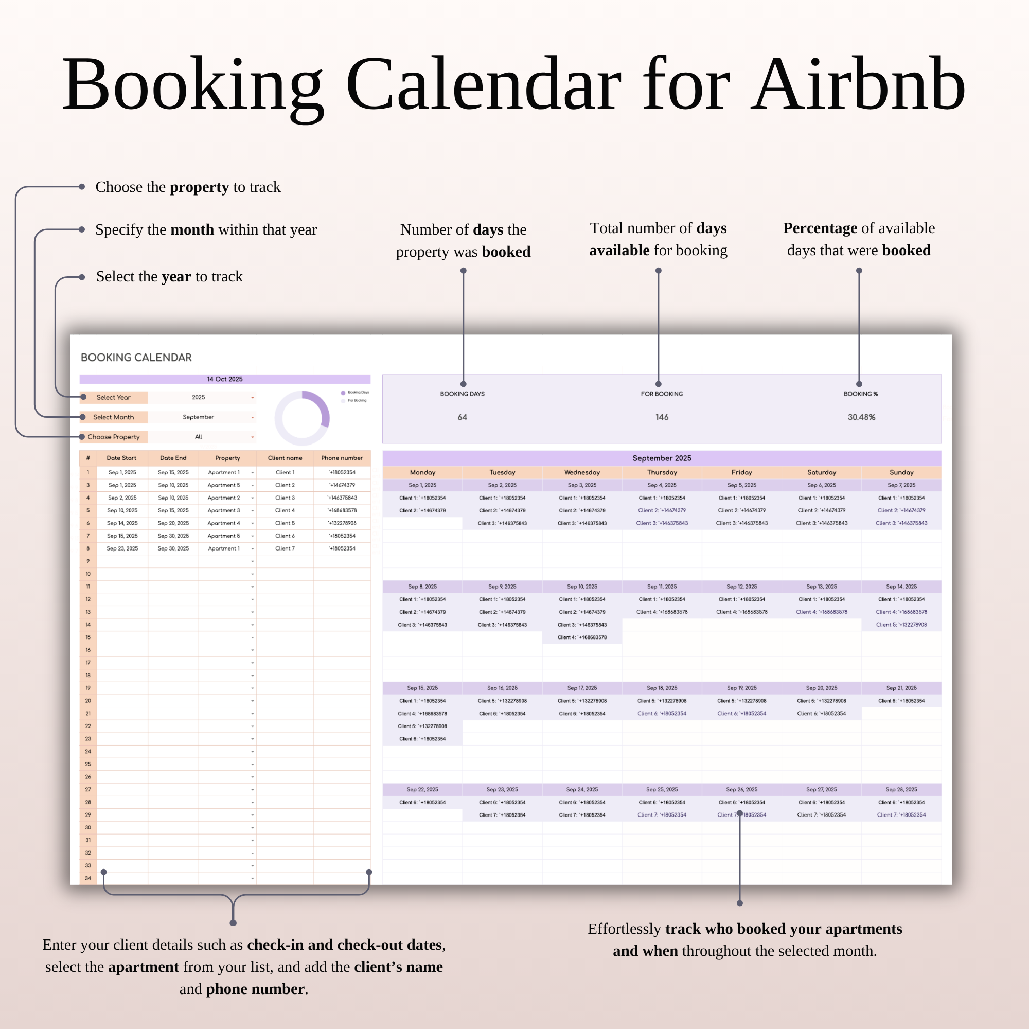 Easily manage your rental bookings — choose the year, month, and property to track, enter client details, and instantly see how many days were booked and available.