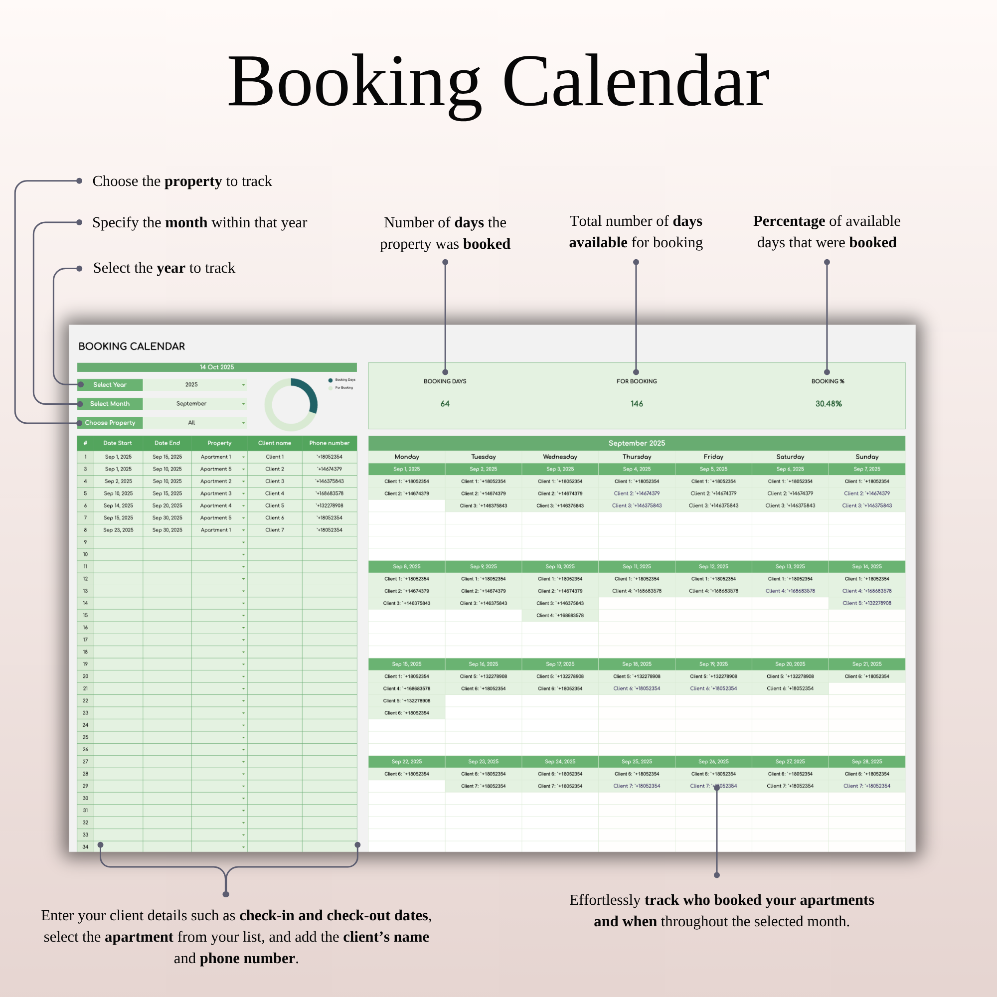 Easily manage your rental bookings — choose the year, month, and property to track, enter client details, and instantly see how many days were booked and available.