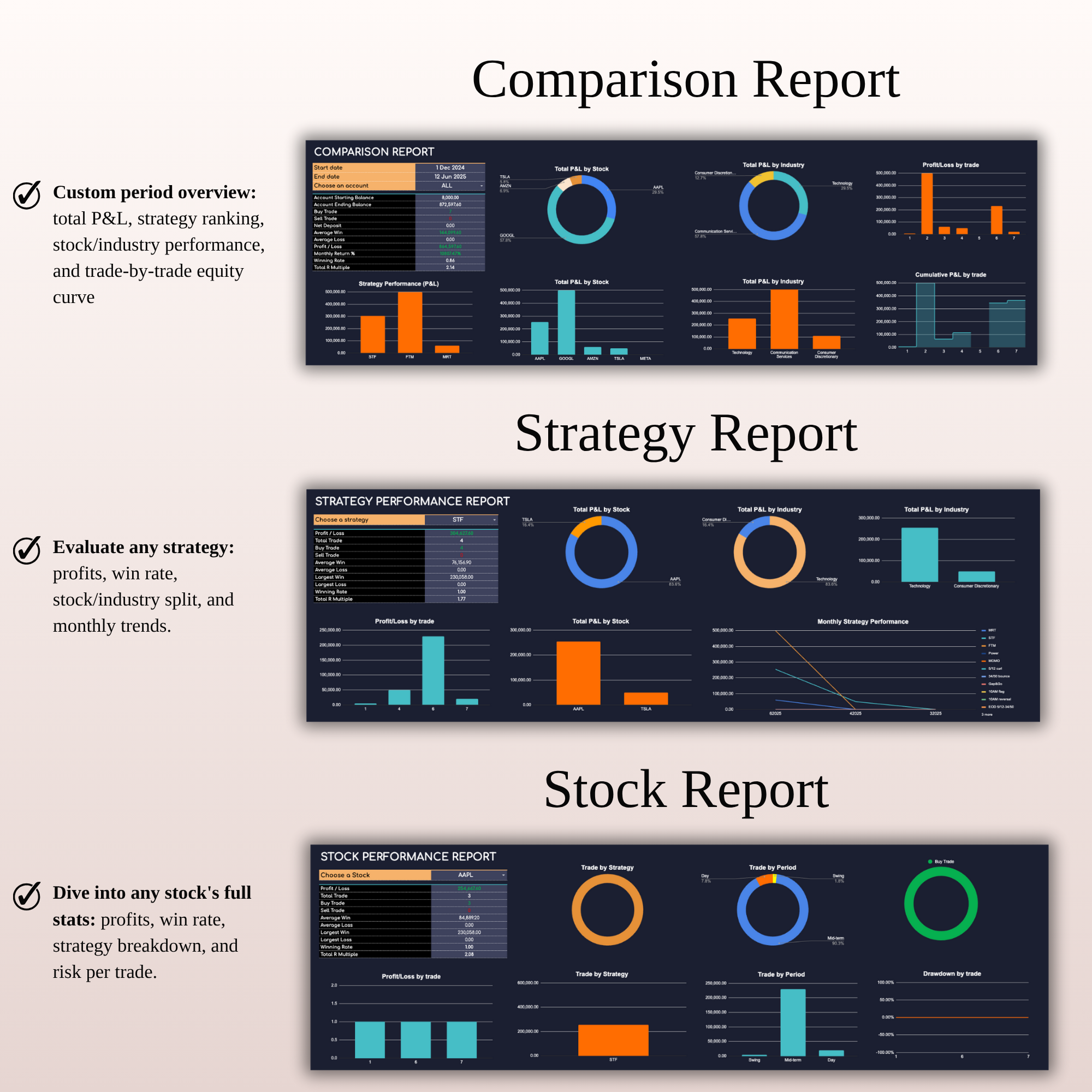 Drill down into each strategy (e.g., breakout, mean reversion, earnings plays): P&L by stock, industry, monthly trend, and trade-level results.