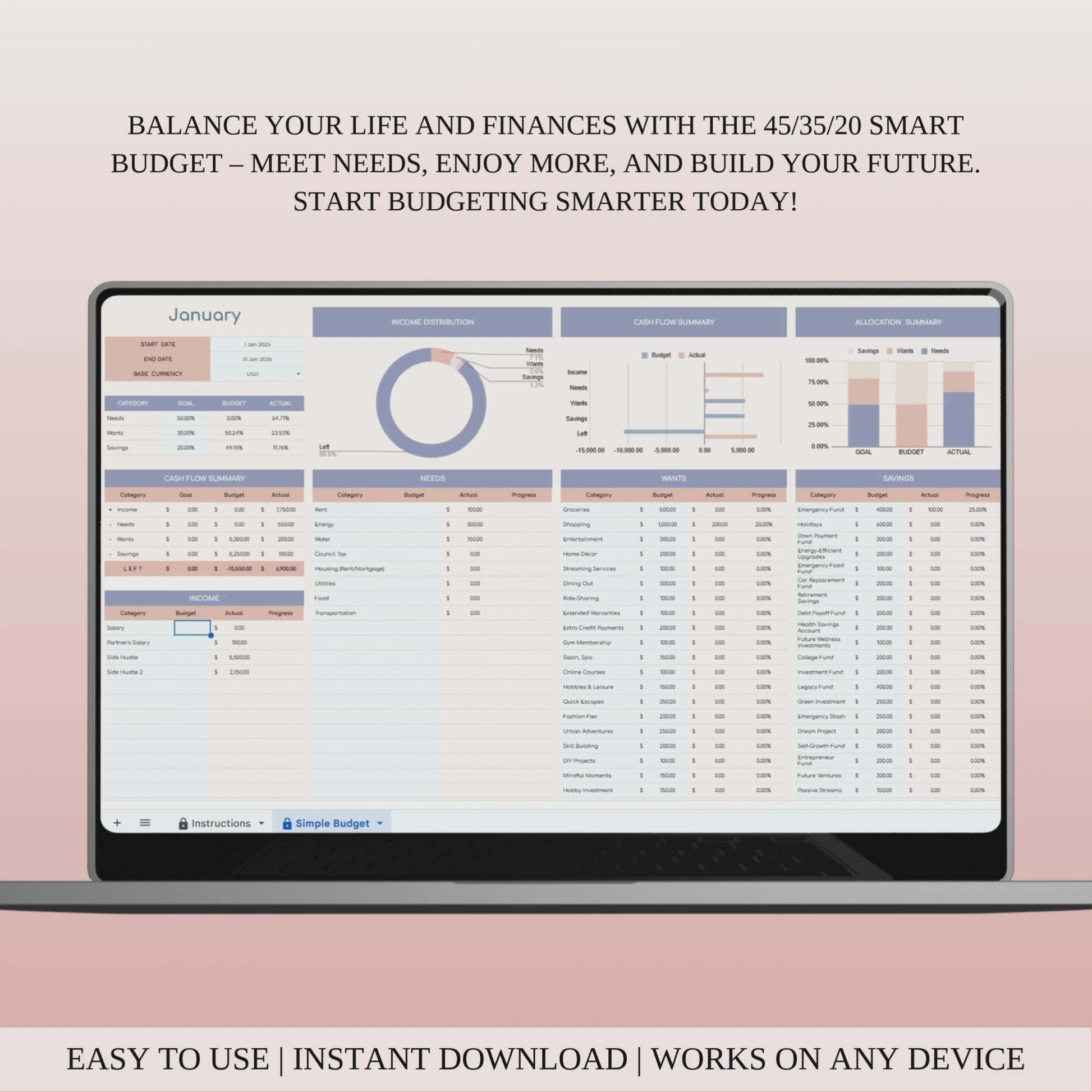 The 45/35/20 Smart Budgeting template is perfect for those who want to achieve a healthy balance between meeting essential needs, enjoying their lifestyle, and securing their financial future. It’s a simple and effective way to manage your money, ensuring that you have enough for the things that matter most while still saving for the long term.