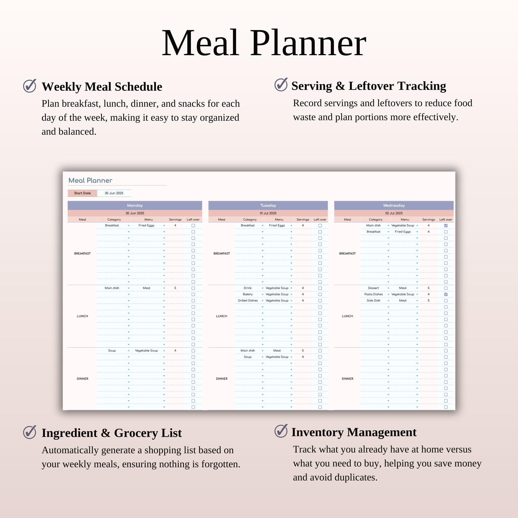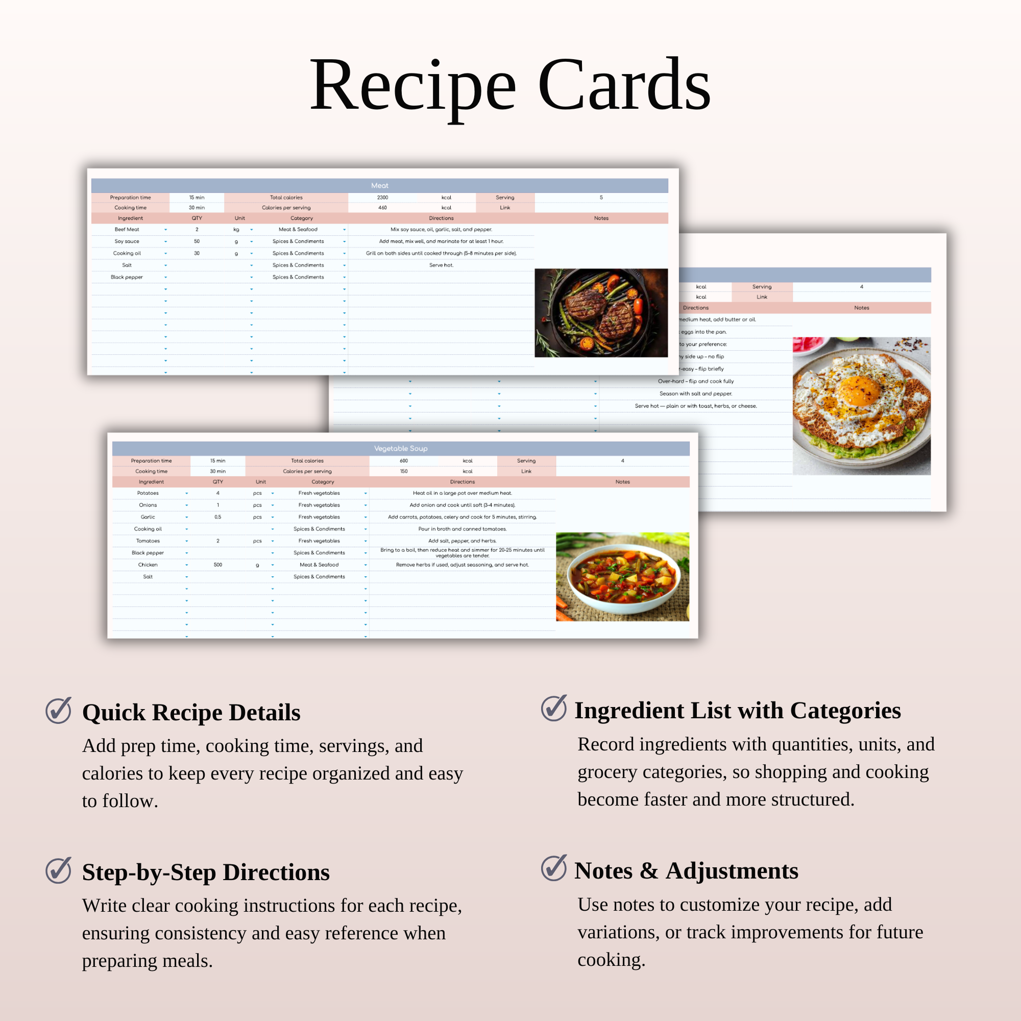 Meal Planner & Recipe Cards: Plan your weekly meals, log recipes with ingredients, servings, and leftovers, and save time on cooking decisions.
