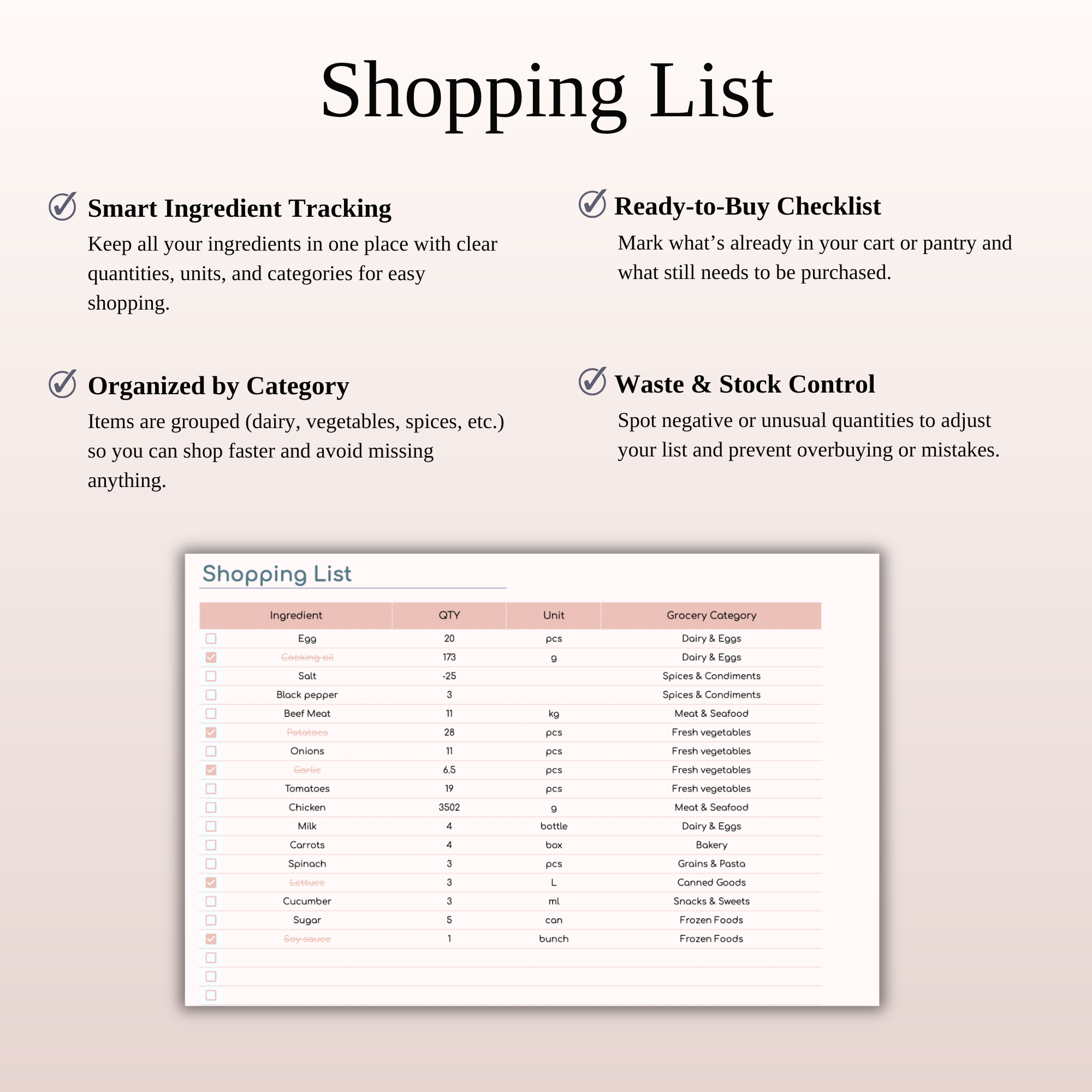 Shopping & Inventory Management: Automatically generate grocery lists from your meal plans, track inventory, and ensure you never run out of essentials.