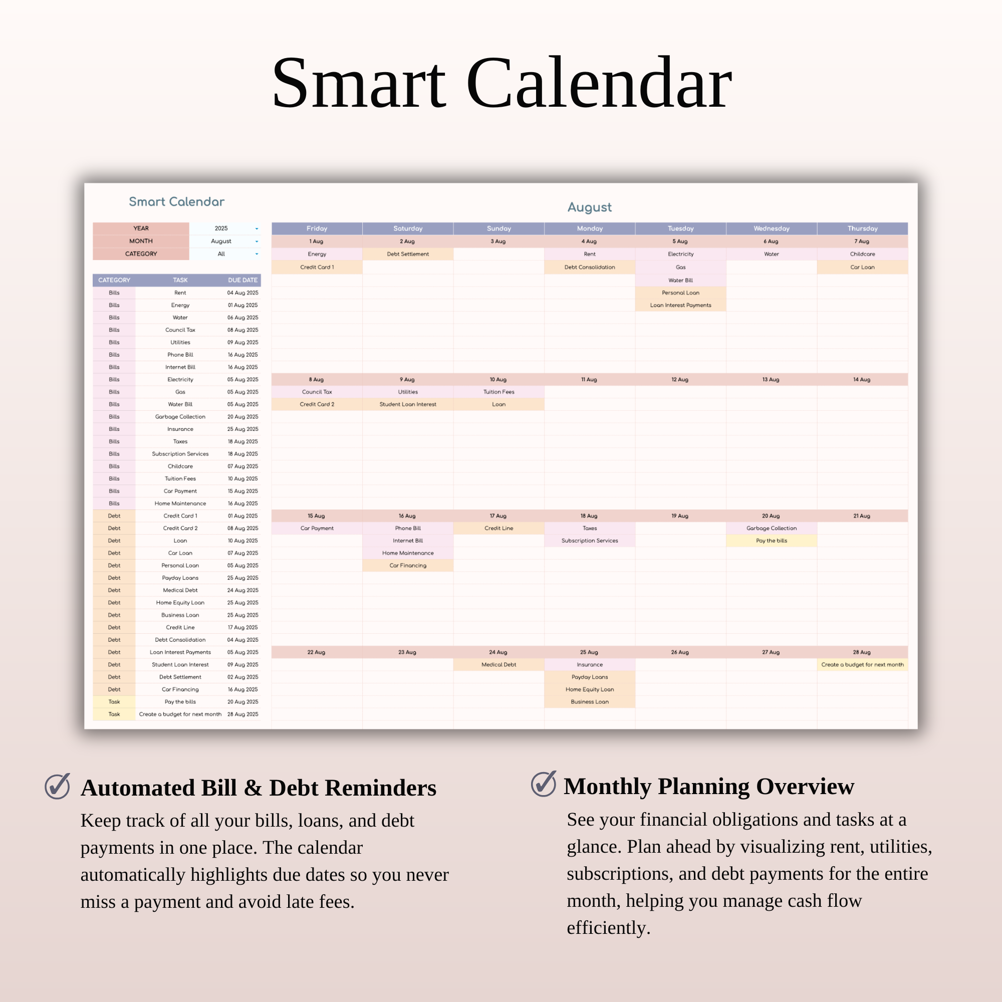 Smart Calendar & Bill Tracker: Keep all bills, loans, subscriptions, and important deadlines in one place, with clear due dates and reminders.