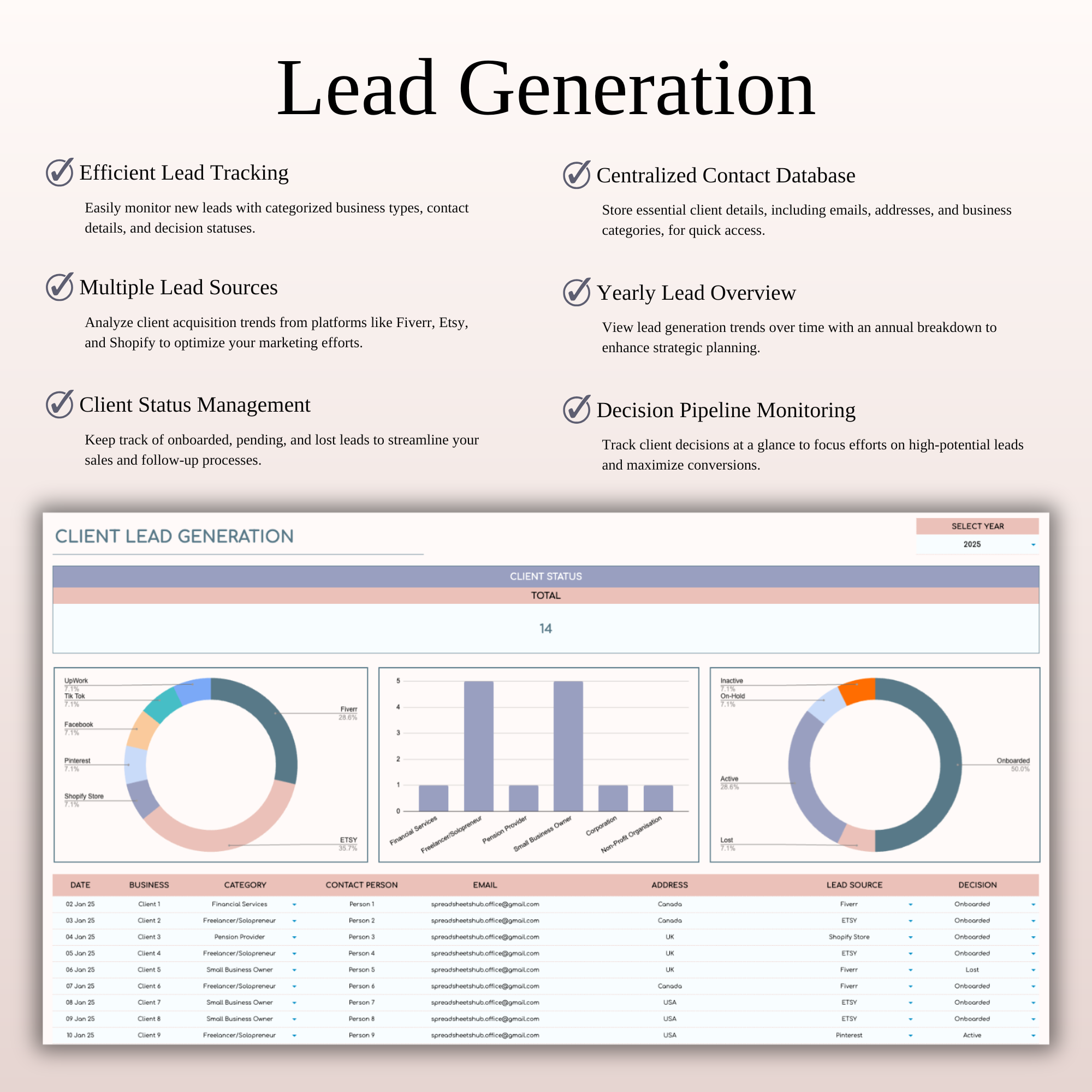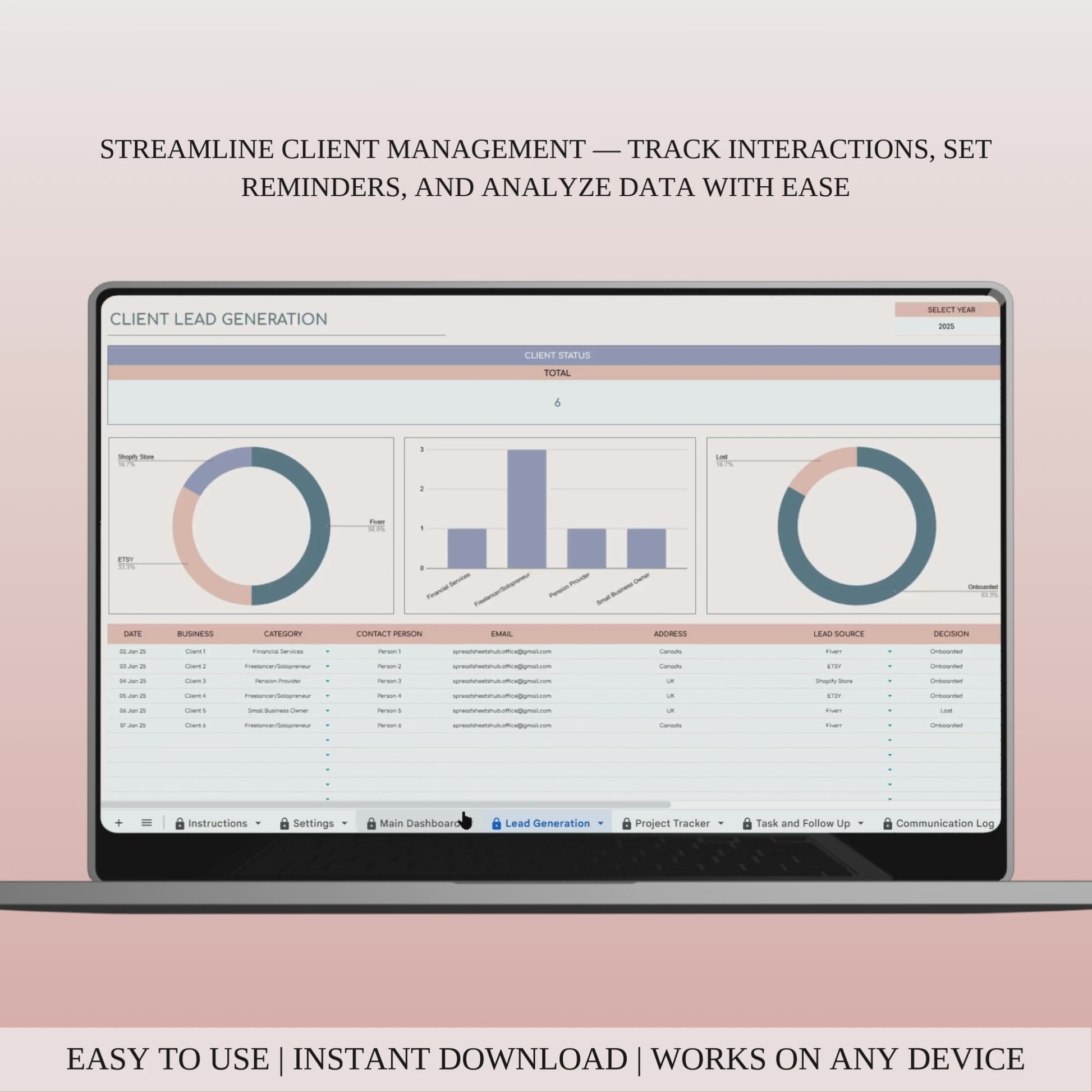This CRM template for Excel and Google Sheets is designed for business owners, sales managers, and marketers who want to efficiently manage customer relationships, track communications, and improve business processes. It is perfect for small to large companies, freelancers, and startups that need to organize their interactions with clients and potential partners.