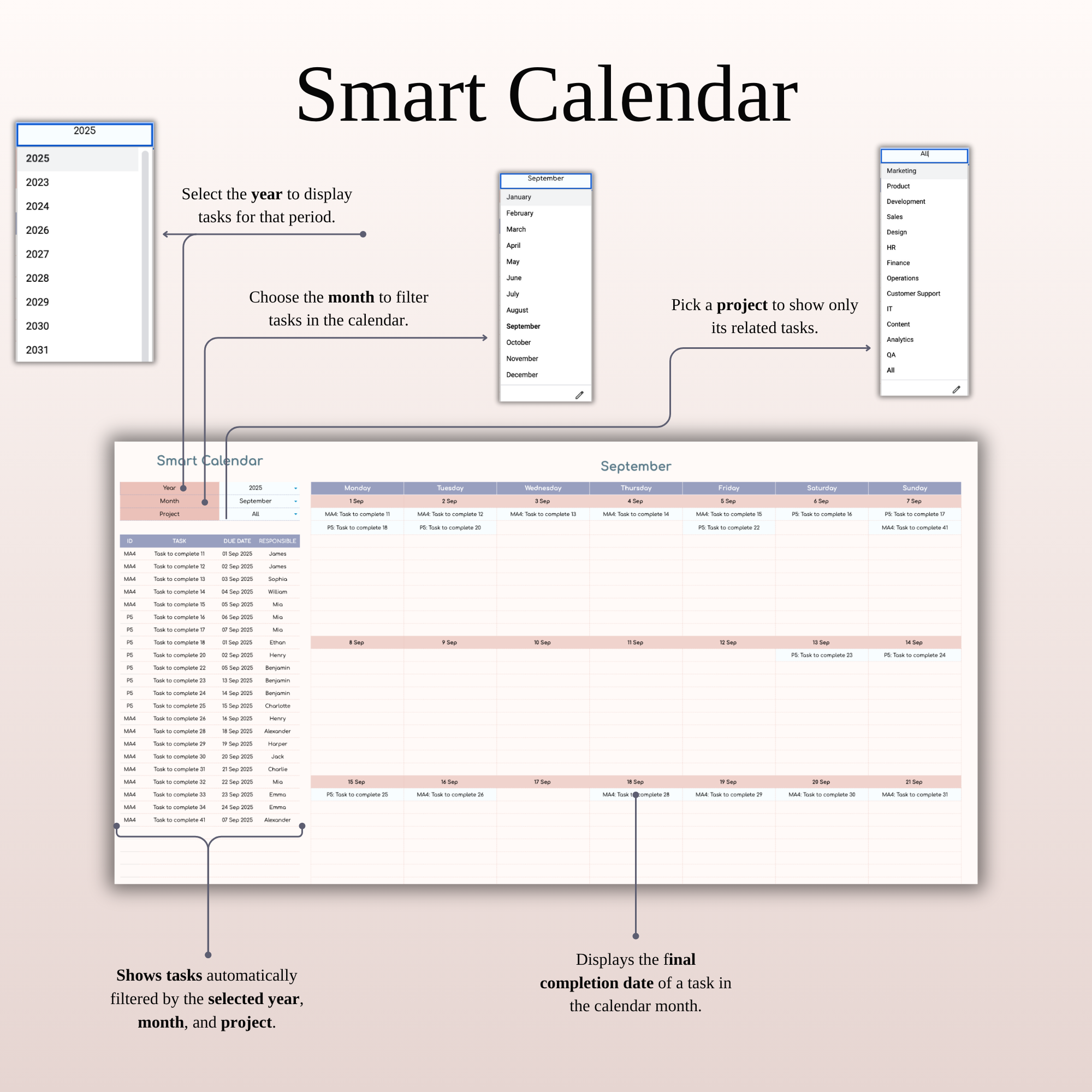 Smart Calendar: Display tasks in a monthly view, highlighting deadlines automatically.