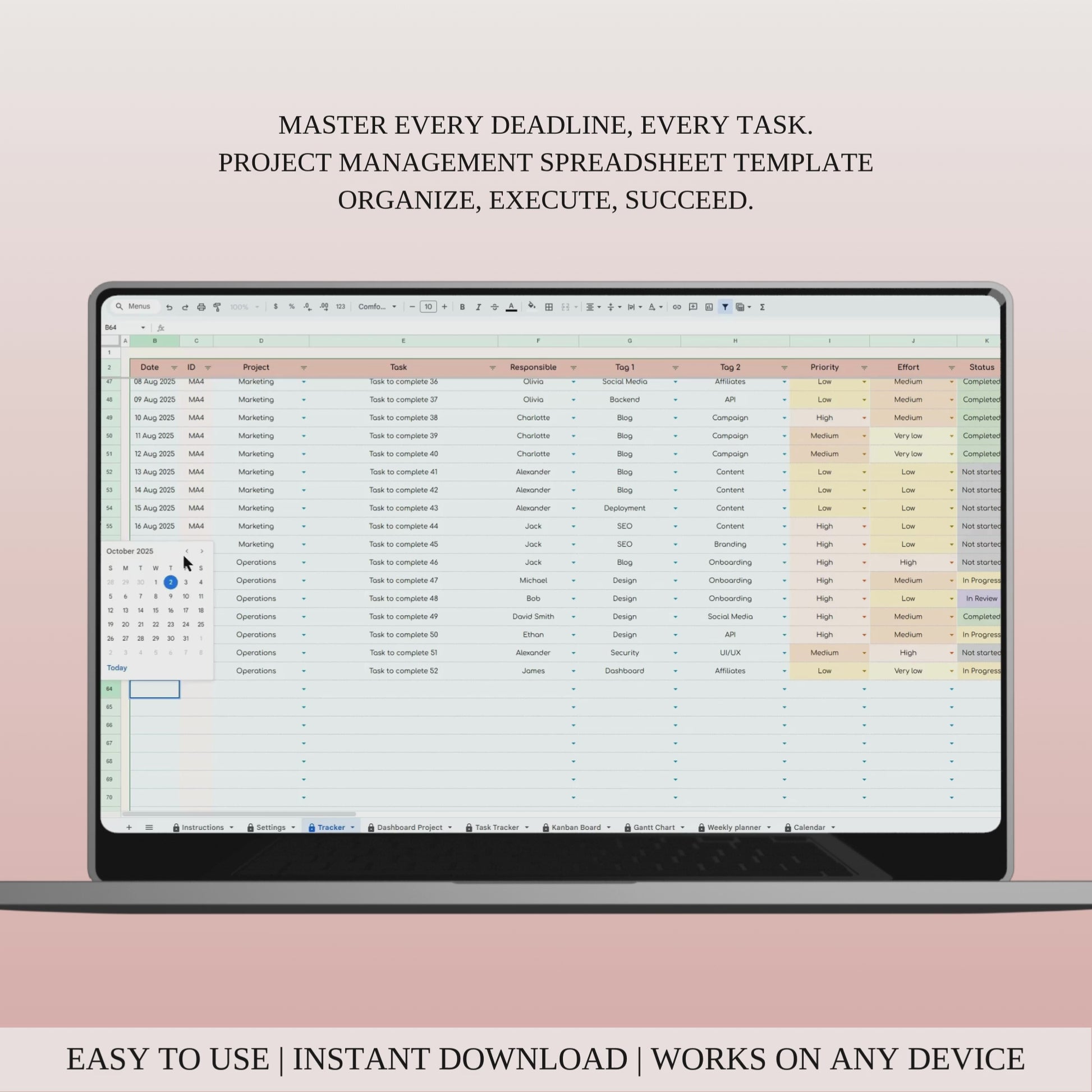 Manage your projects, tasks, and team efficiently with this all-in-one spreadsheet template designed for professionals and teams who want clarity, organization, and productivity.