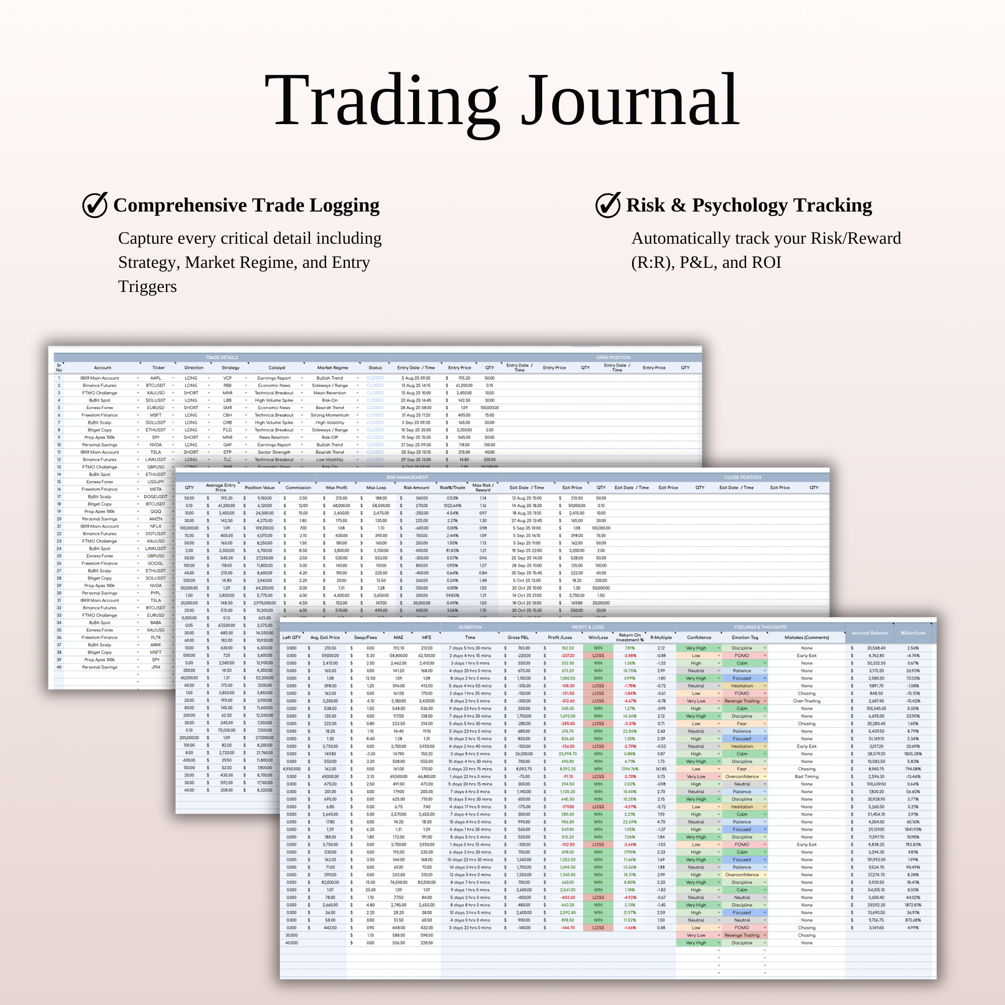 Focus on your trades while the journal handles all the math—from Position Sizing to R-Multiple and ROI% instantly. -