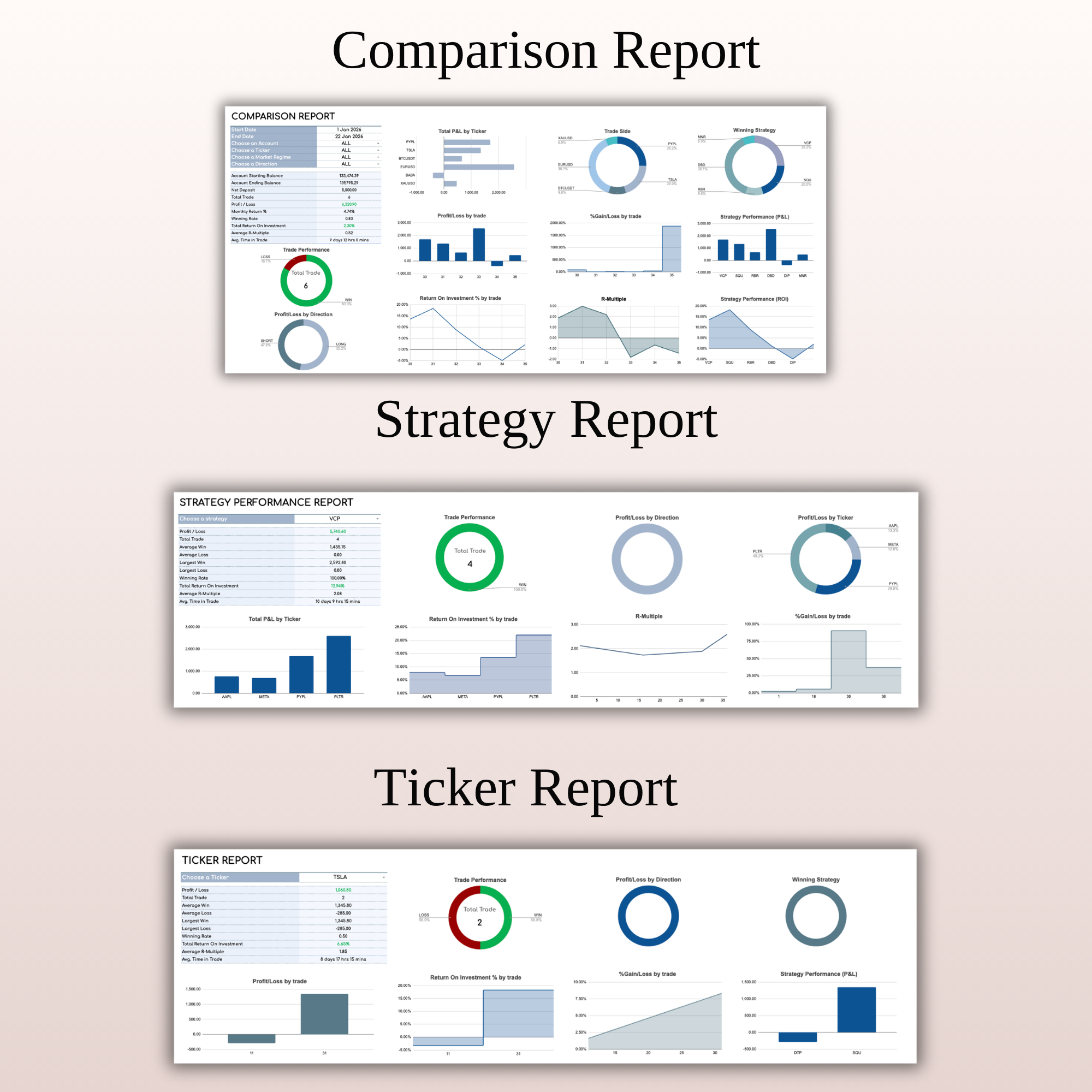 Toggle between Monthly and Annual Reports to see your equity curve, win rate, and profit distribution by ticker or strategy. -
