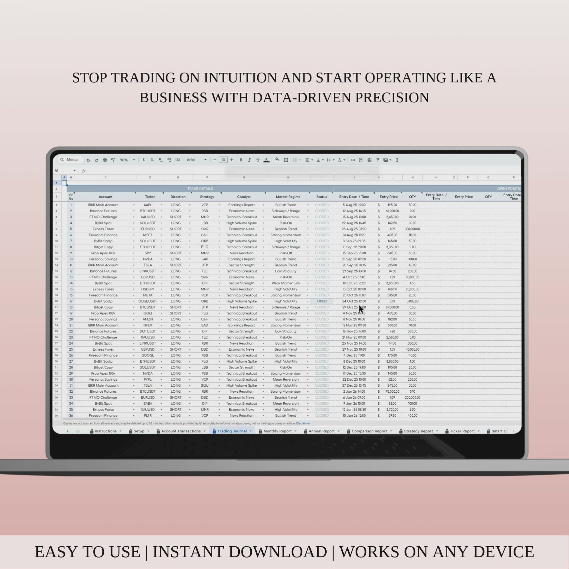 This journal is built for Swing Traders who hold positions for days or weeks and need a robust system to track account growth, discipline, and strategy ROI.