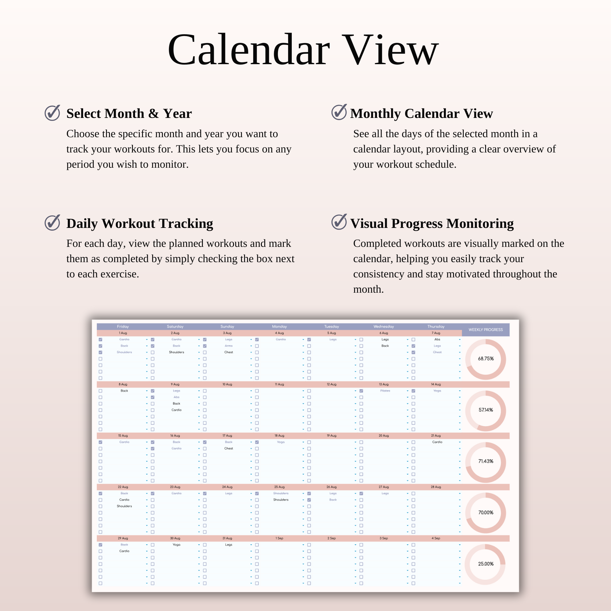 Plan your workout days by month and week, mark completed workouts, rest days, and keep an overview of your training consistency.
