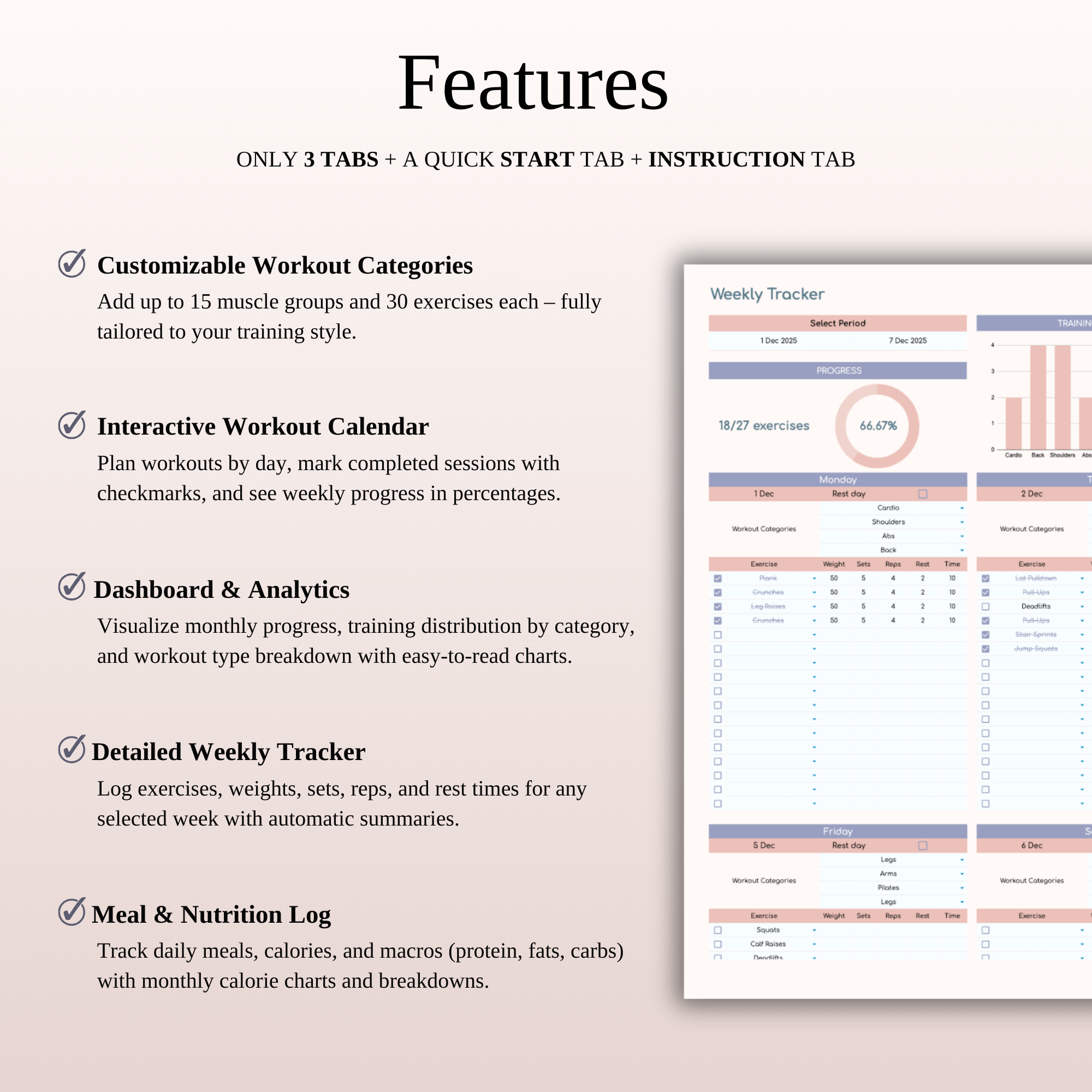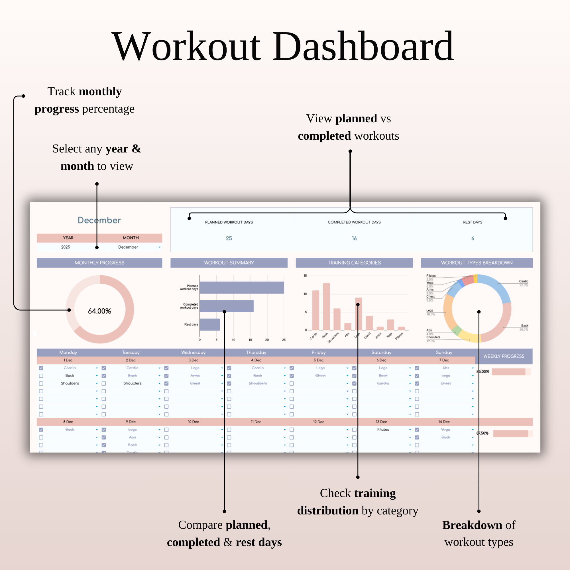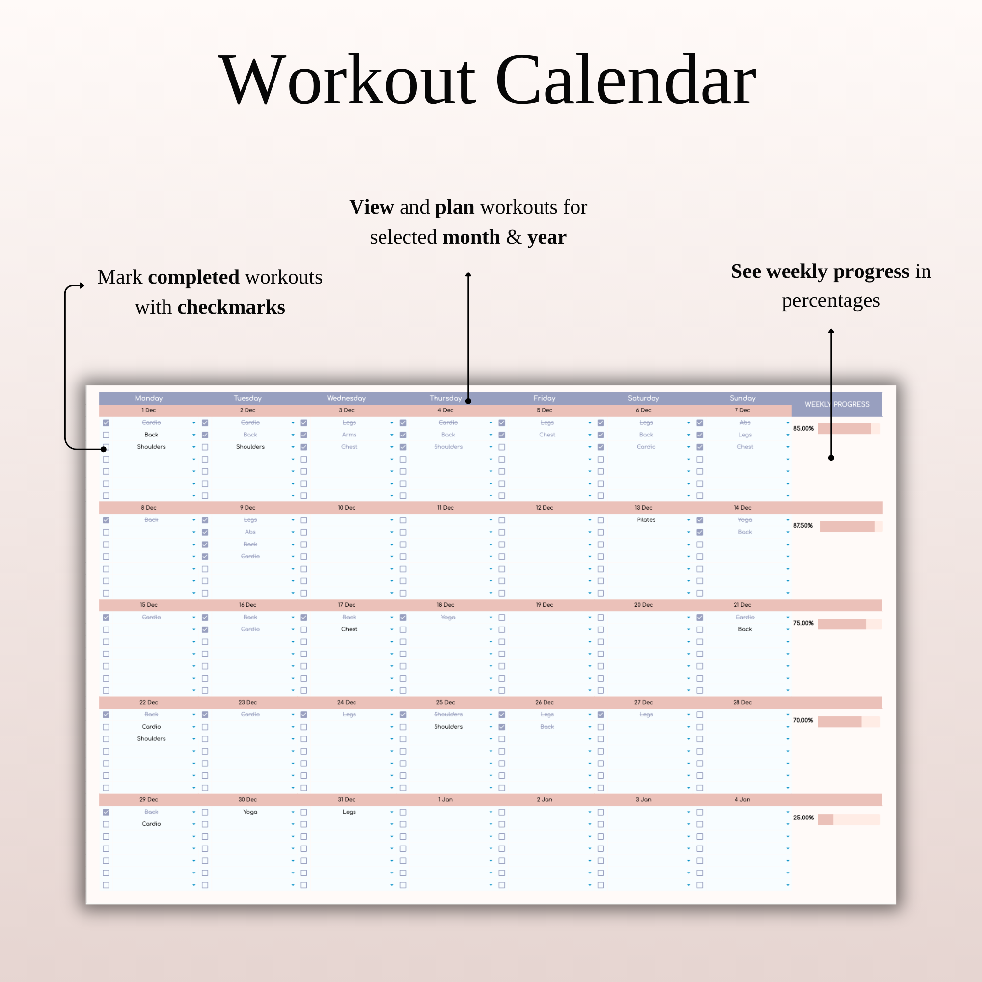 - Smart Workout Calendar – Plan your entire month in seconds, check off completed days, and instantly see your weekly progress in percentages.