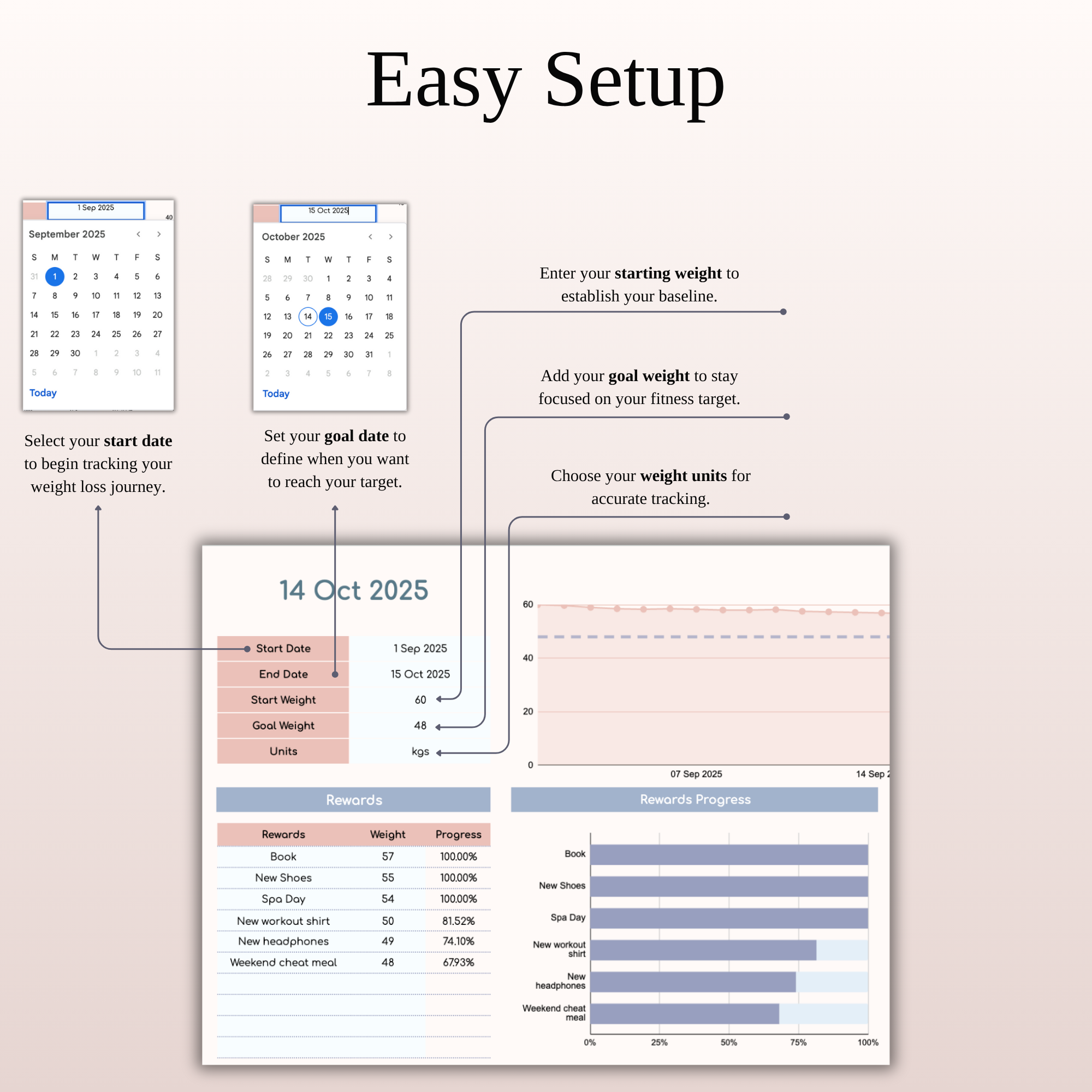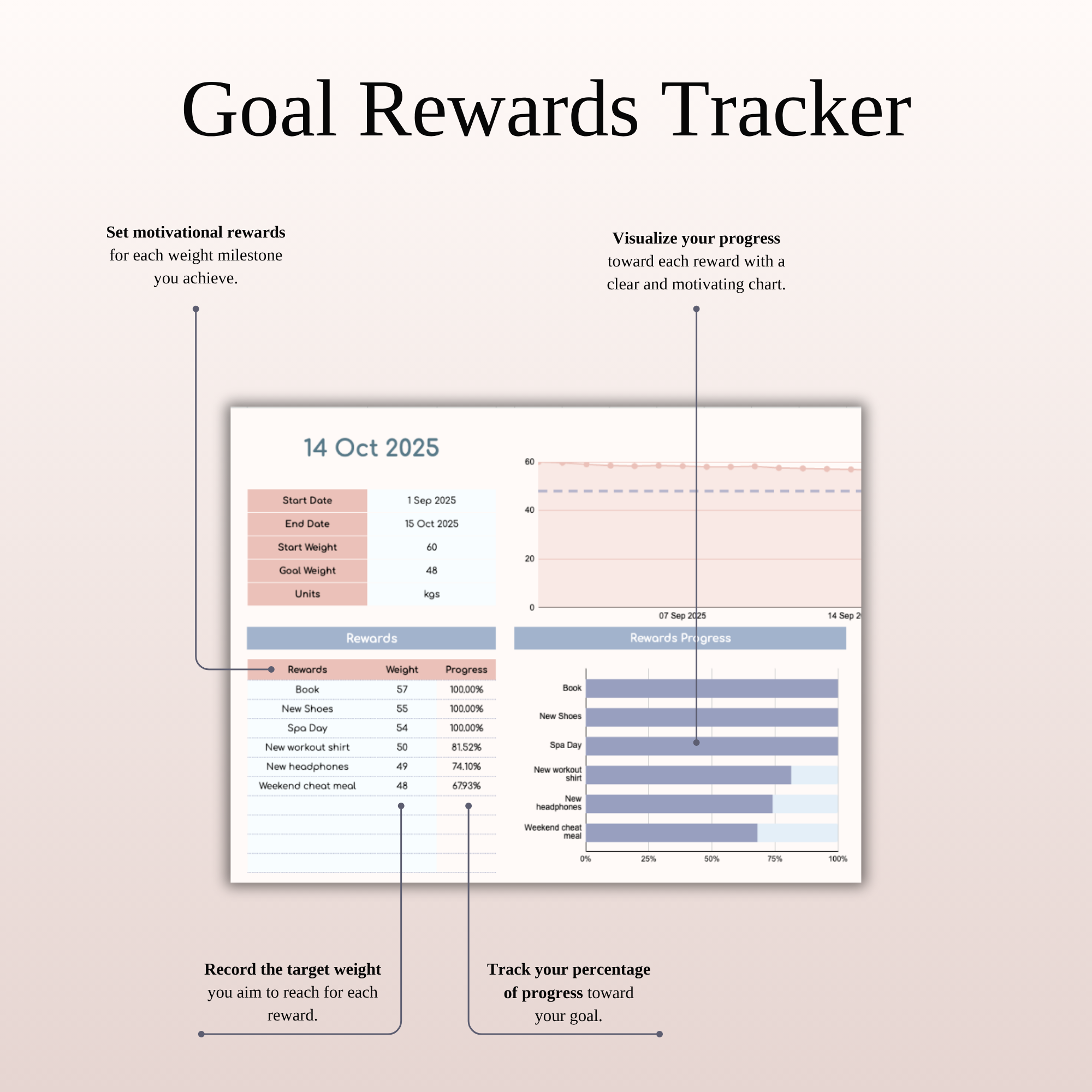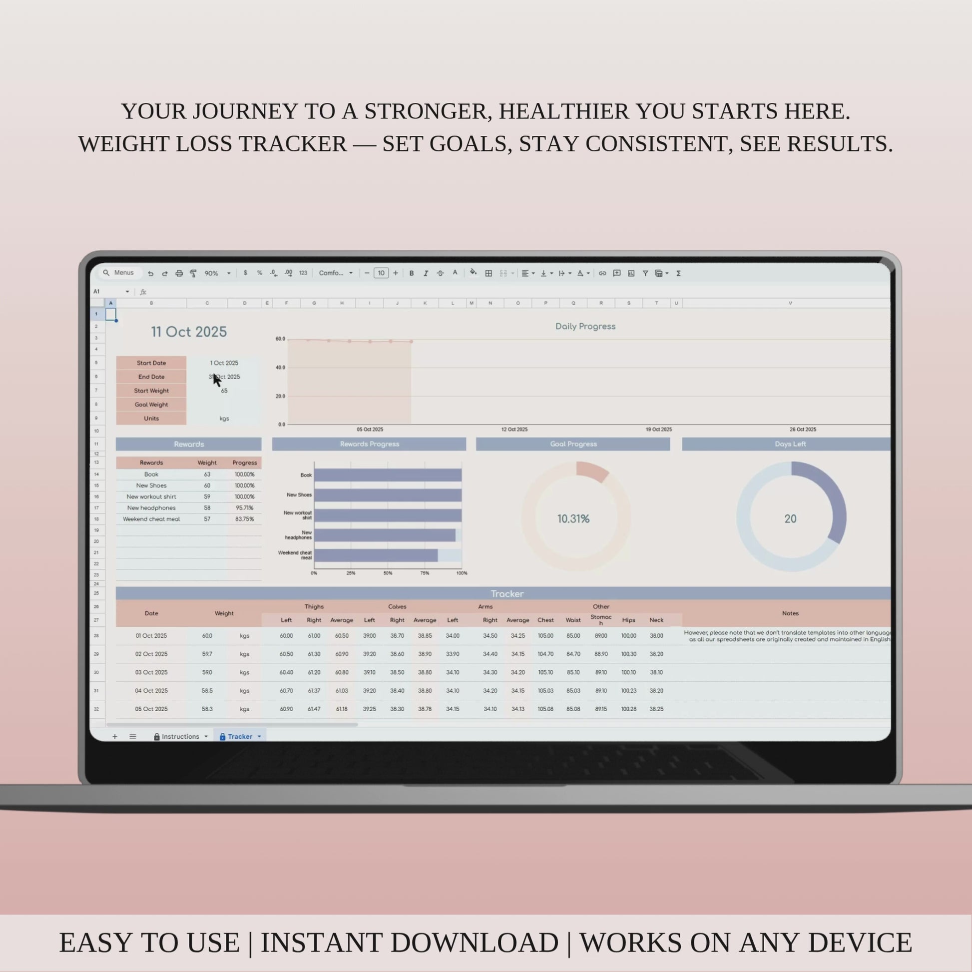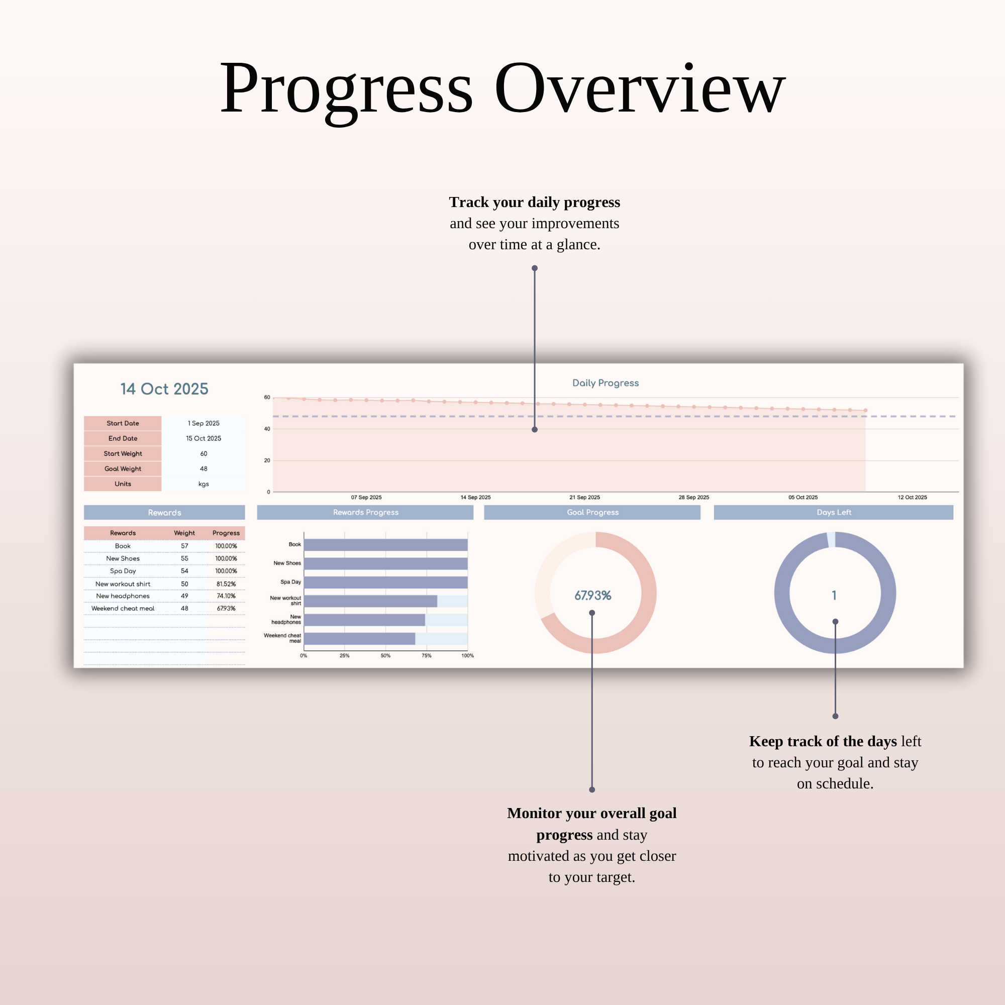 This tracker allows you to set clear goals, track your daily progress, and visualize your achievements through easy-to-read charts and analytics. Whether you're losing a few pounds or making a long-term lifestyle change, this template helps you stay focused and inspired every step of the way.