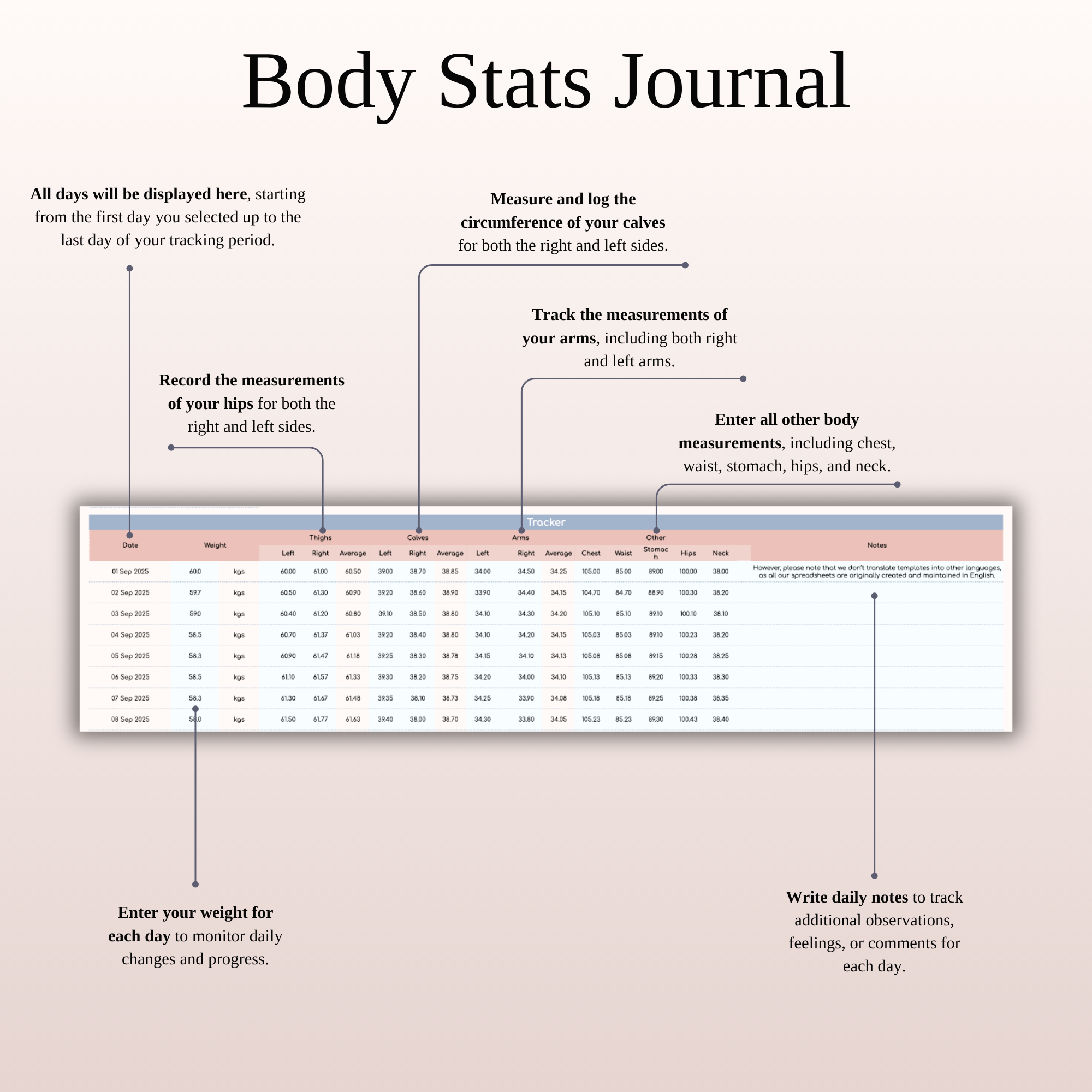 Body Measurements – Track hips, waist, chest, arms, calves, and more for a full-body transformation overview.
